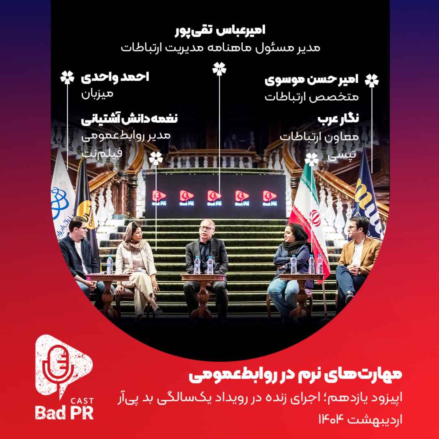 من احمد واحدی هستم و در این قسمت که به صورت زنده و در رویداد روز ارتباطات و روابطعمومی، همزمان با یکسالگی پادکست و ویدیوکست بد پیآر در حضور فعالان حوزههای ارتباطات، روابطعمومی و رسانه در کتابخانه جندیشاپور ایرانمال ضبط شده، درباره موضوع مهم مهارتهای نرم در روابطعمومی با امیرحسن موسوی متخصص ارتباطات، نگار عرب معاون ارتباطات تپسی، امیرعباس تقیپور مدیرمسئول ماهنامه مدیریت ارتباطات و نغمه دانش آشتیانی مدیر روابطعمومی فیلمنت گفتگو میکنم